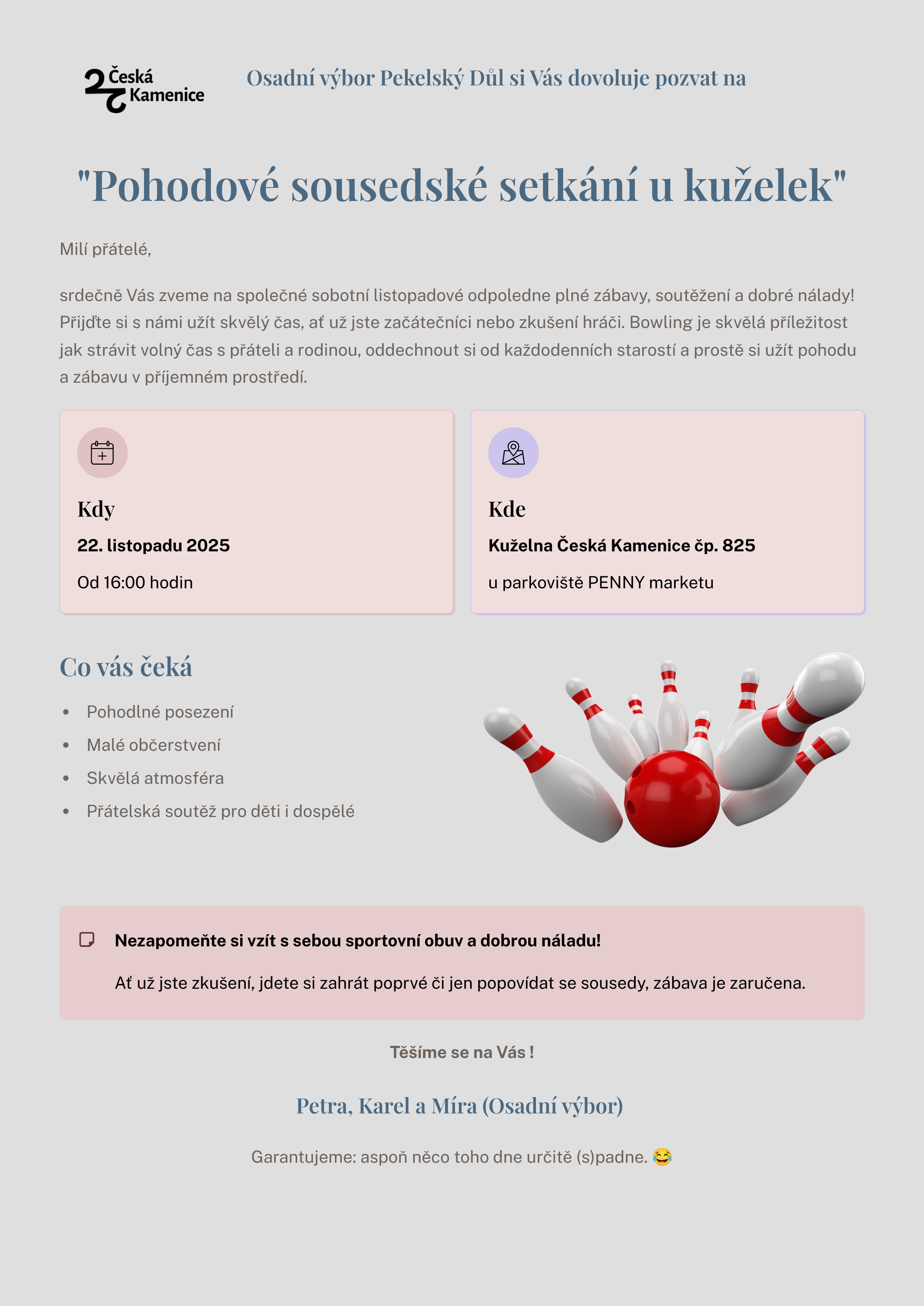 Vzhledem k událostem ve světě a ve městě, jsme díky velmi intenzivnímu osobnímu úsilí nejmenovaných místních osadníků, chvála jim, dokázali pouze vyčerpat Technickému zařízení města Česká Kamenice jejich poslední železnou zásobu černých kontejnerů. Kontejnery byly označeny příslušnými samolepkami a odlišeny tak pro správný typ tříděného odpadu k uložení. Nyní tedy máme k dispozici kontejner na plasty a papír. Ještě nám schází slíbený kontejner na sklo.